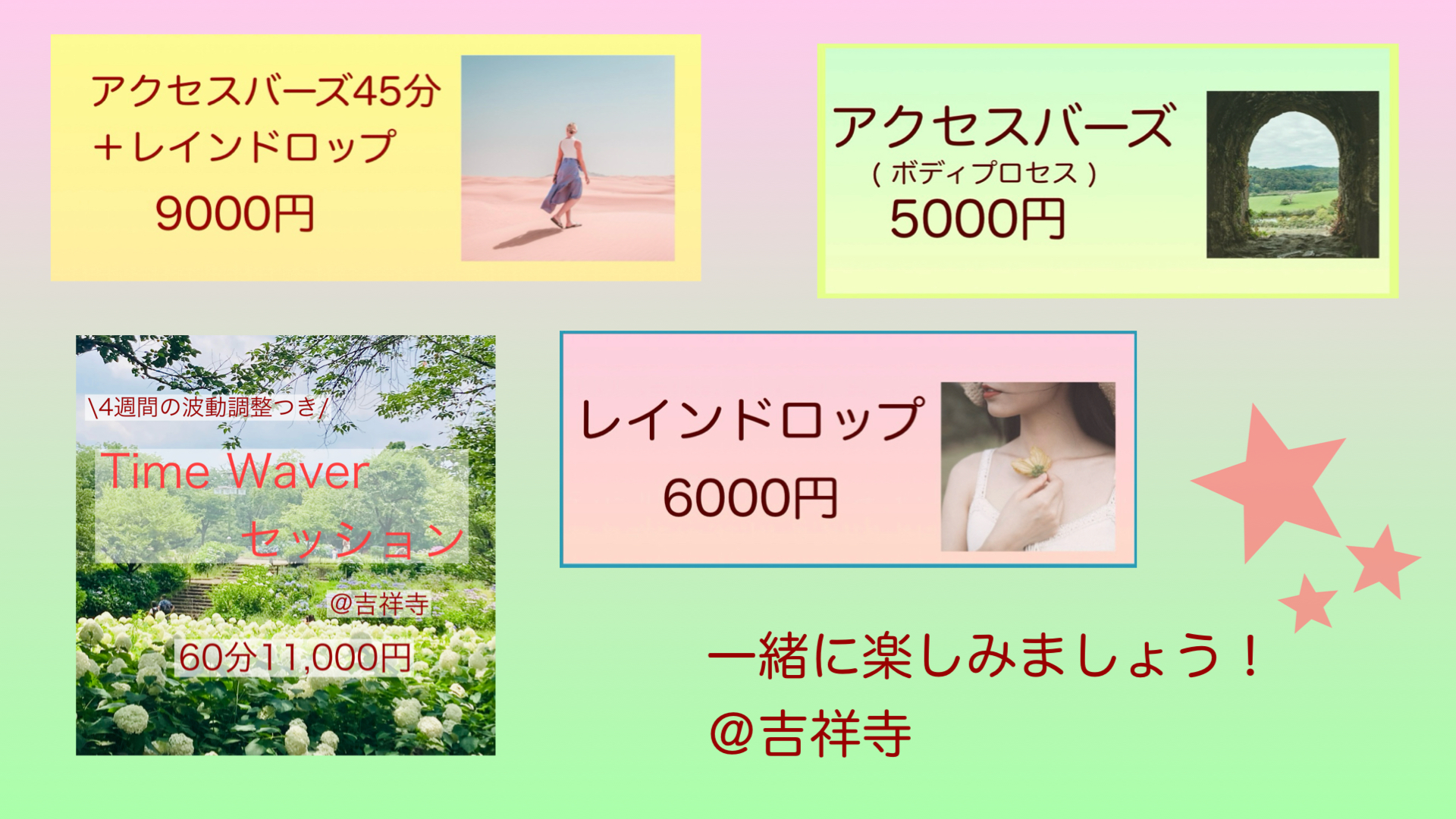 セッションは誰もが気軽に楽しめるように「レインドロップ6000円」「アクセスバーズ60分5000円」「タイムウェバー30分+アクセスバーズ30分 8000円」を基本に柔軟に提供し、セッションへの敷居を低くしています。また、2020年に始めたソマヴェディック販売も当サロンの主軸の一つで、ソマヴェディックに興味をもち セッションを受けに来てくれる方もいらっしゃいます。